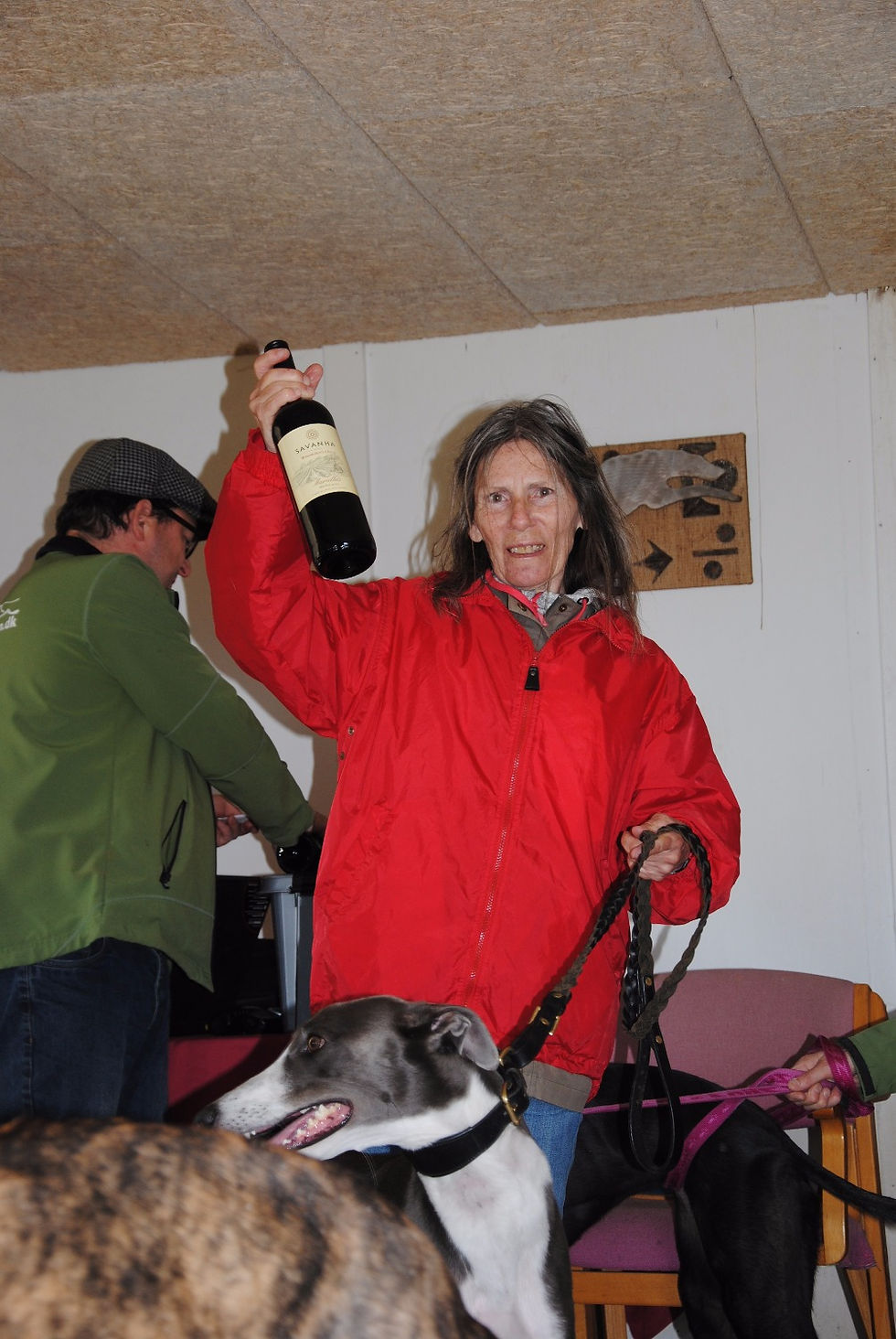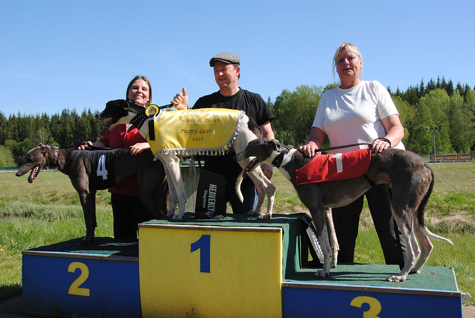Katniss fick en pangstart och utmanade Irlandsimporten Starshinechilli (som var klar favorit) hela vägen. I sista sväng fick hon ett litet stopp när hon var nära att springa in i rumpan på favoriten, men hon tog fart igen och i mål var hon bara slagen med tre hundradelar! En riktigt bra prestation och en andraplats i CGRC Puppy är vi såklart väldigt stolta över. Dessutom var hon ju 1) Bästa svenskfödda hund och 2) Bästa tik (ettan, trean och fyran är hanar).
